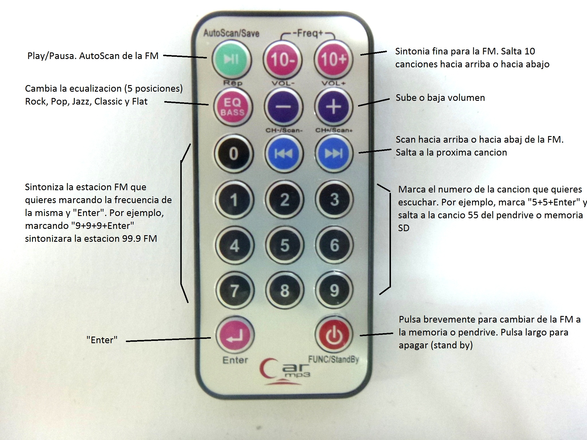 Sintoniza las estaciones FM, adelanta o atrasa las canciones, cambia el modo de ecualizacion, alterna las funciones fm y MP3 player, Enciende y apaga el equipo (Standby).